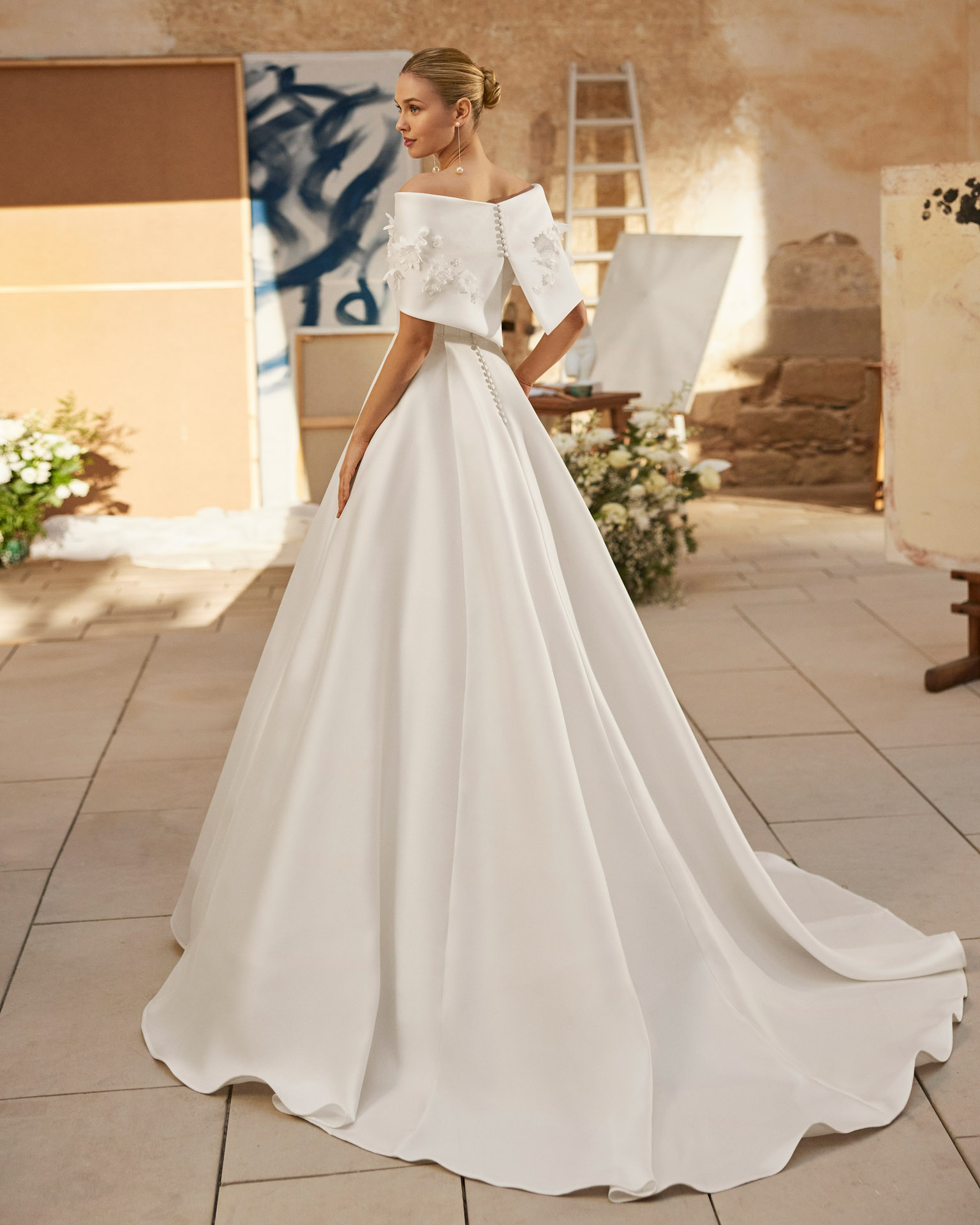 The Aire Barcelona Moxie bridal gown is the epitome of modern romance, designed for brides who want both drama and elegance on their wedding day. This stunning wedding dress features a voluminous silhouette, creating a graceful, flowing presence as you walk down the aisle. The strapless neckline beautifully frames the shoulders and décolletage, while the open back adds a bold and contemporary touch, perfect for a bride seeking timeless style with a modern twist.