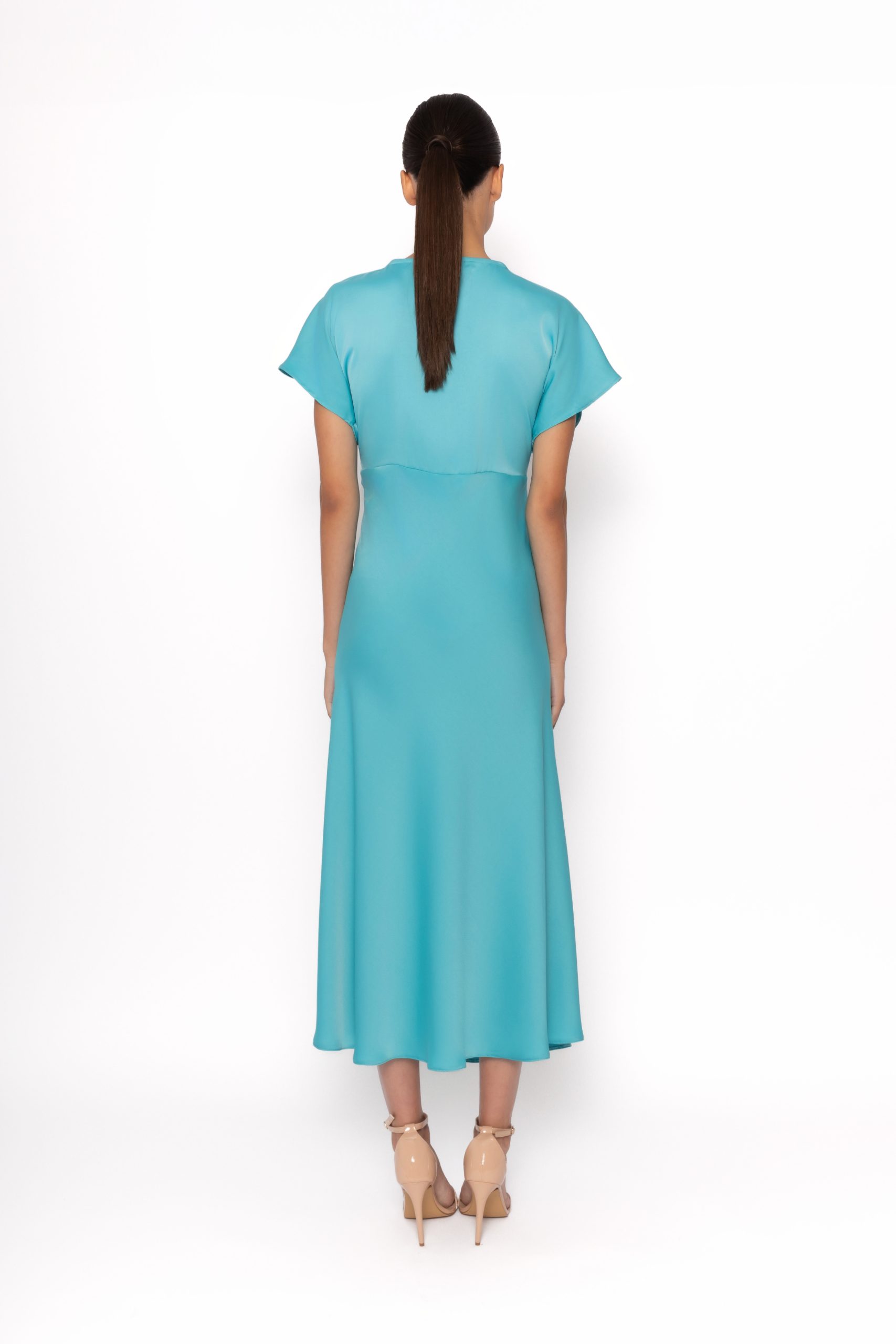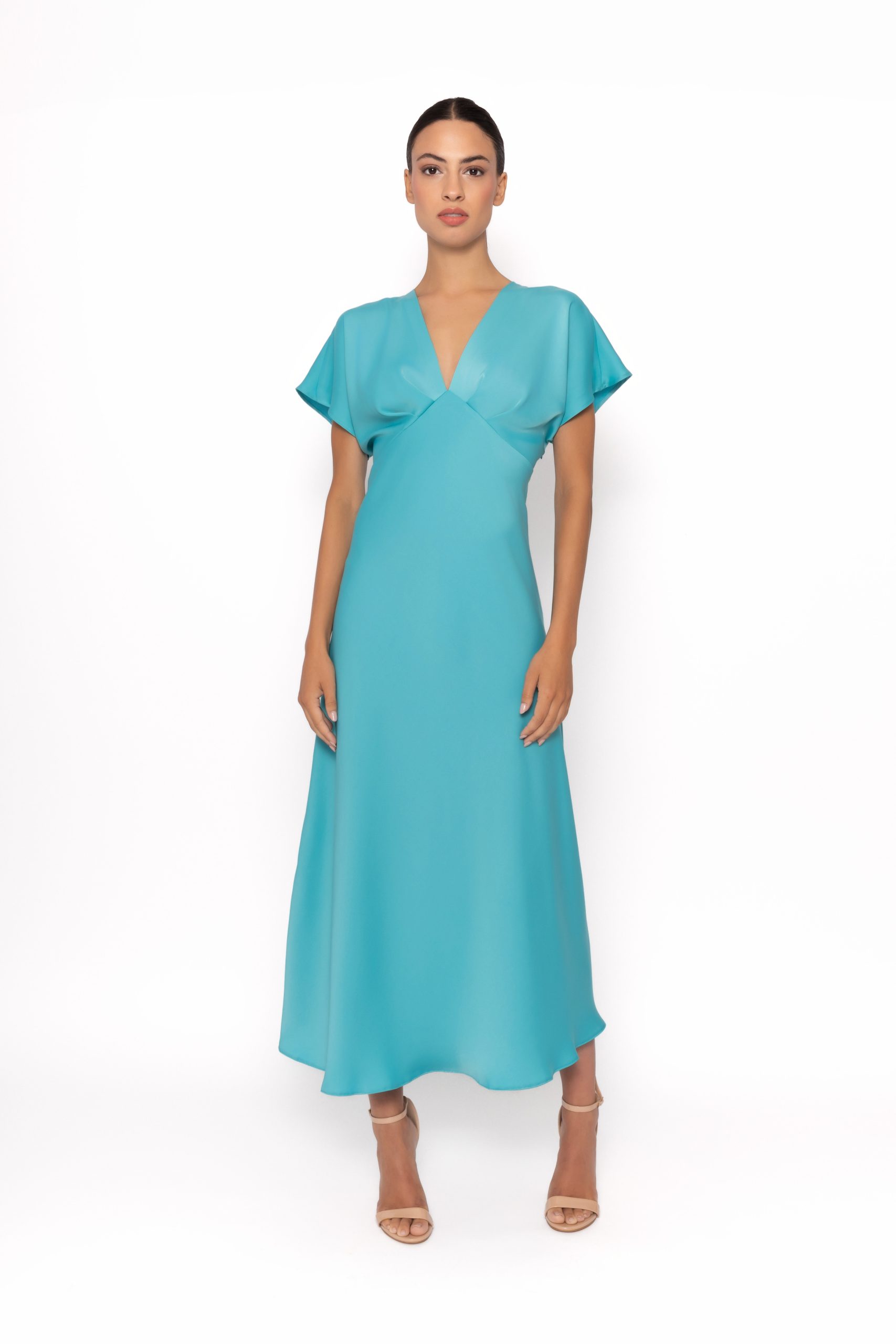 An elegant teal midi dress featuring a flattering V neckline, flutter sleeves, and flowing A line skirt for timeless occasion style.