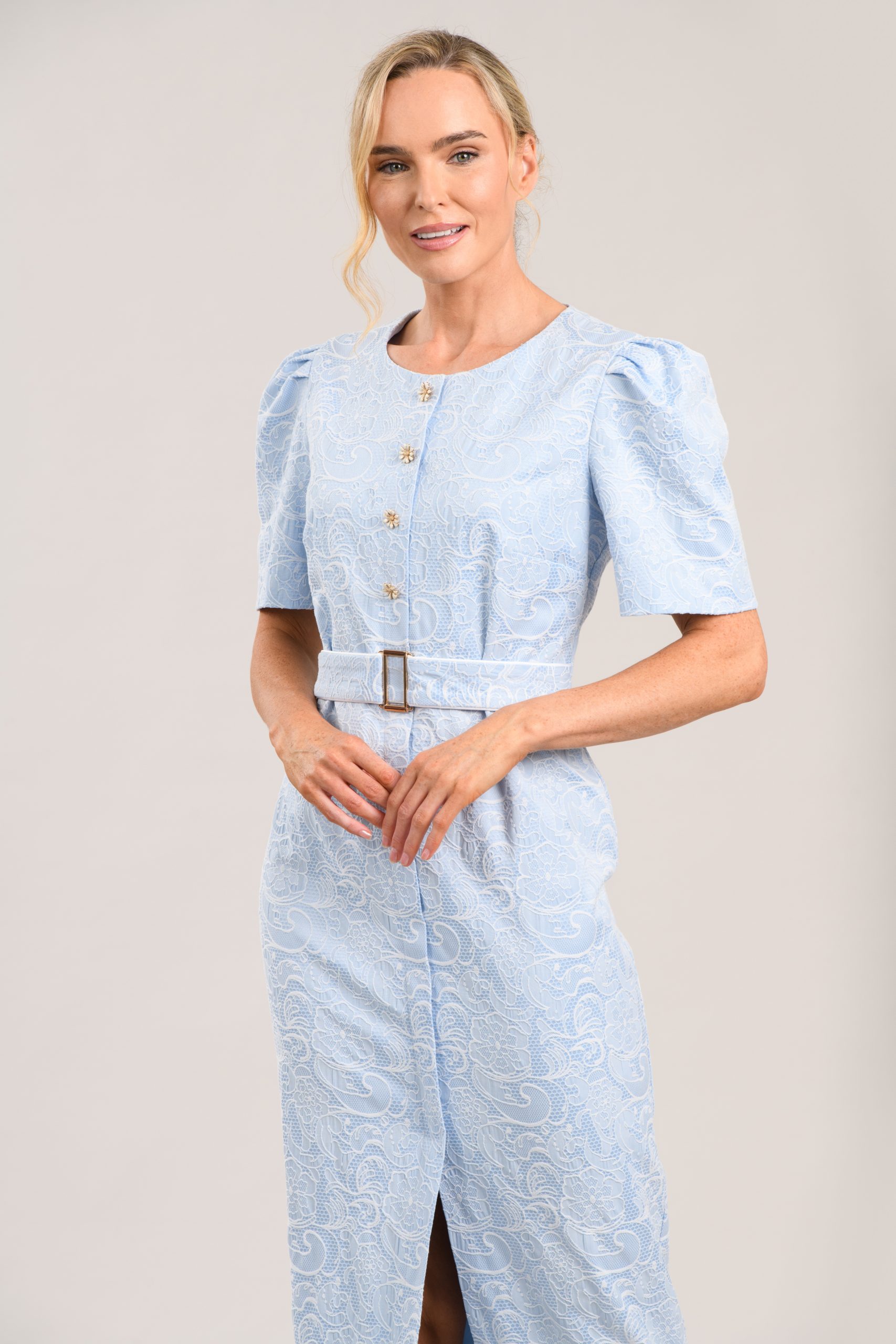 Elevate your style with the Caroline Kilkenny ‘Carrie’ dress, featuring jacquard detail, daisy buttons, and a gold belt in mint or blue.
