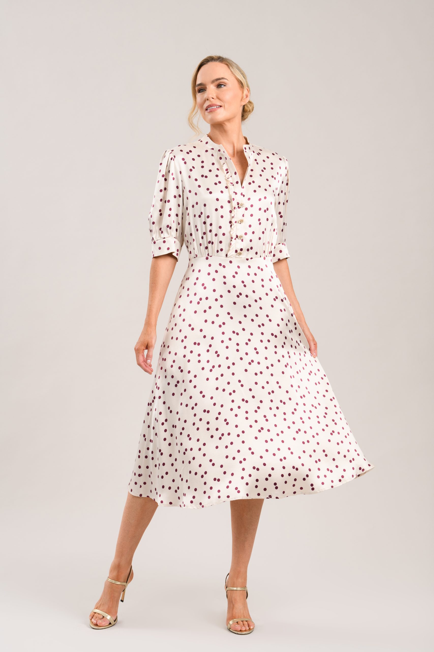 Elevate your occasion wear with the Caroline Kilkenny ‘Dove’ dress, featuring a charming polka dot terracotta print and daisy button detail.