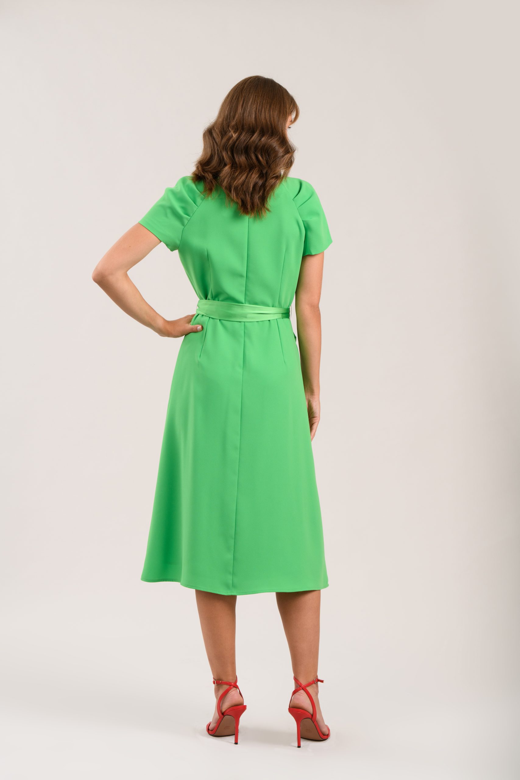The Caroline Kilkenny Louie dress features a stylish v-neckline, cap sleeves, and a belted waist. Perfect for special occasions, it is available in royal blue and intense green, offering versatile elegance.
