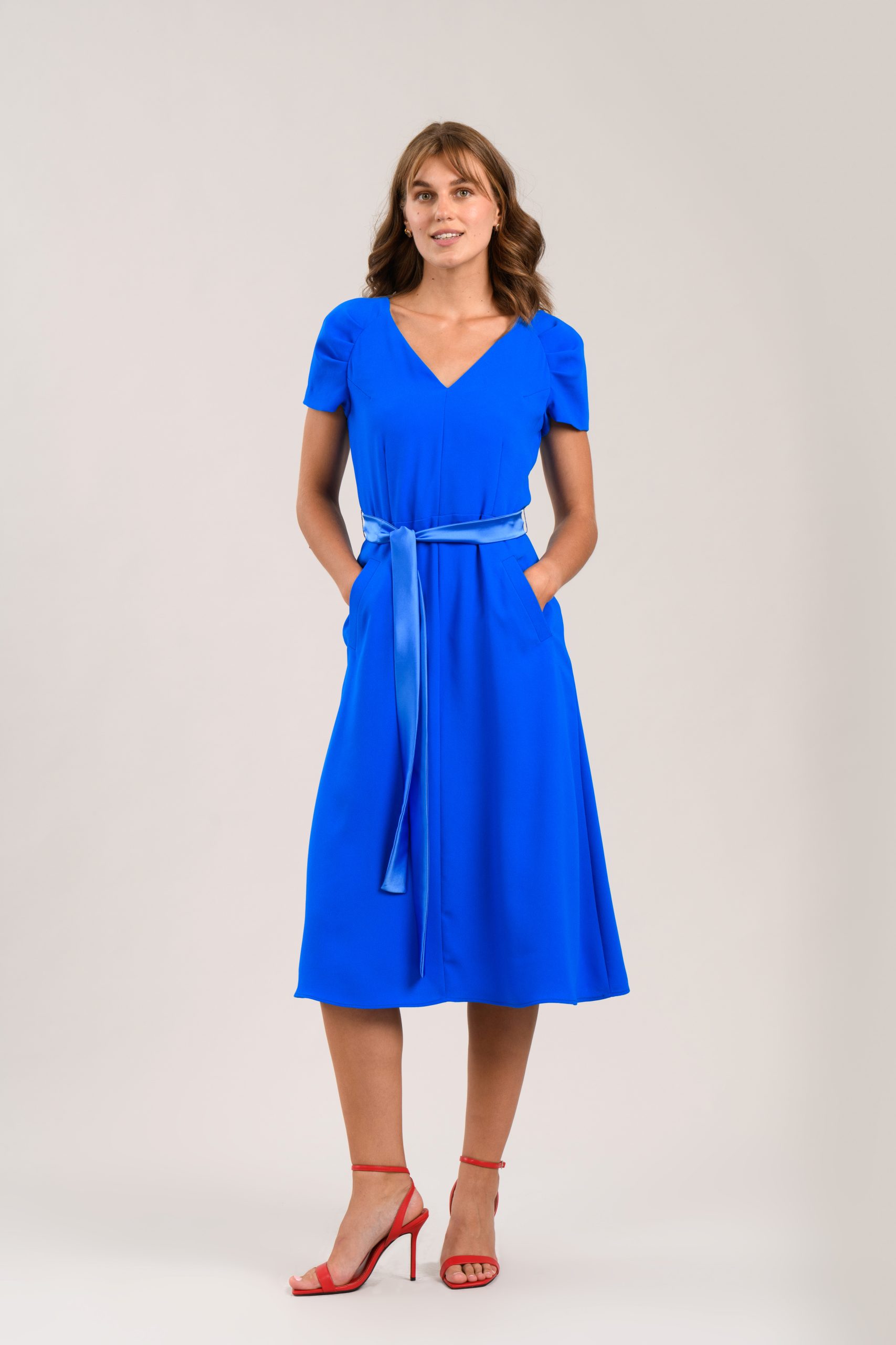 The Caroline Kilkenny Louie dress features a stylish v-neckline, cap sleeves, and a belted waist. Perfect for special occasions, it is available in royal blue and intense green, offering versatile elegance.
