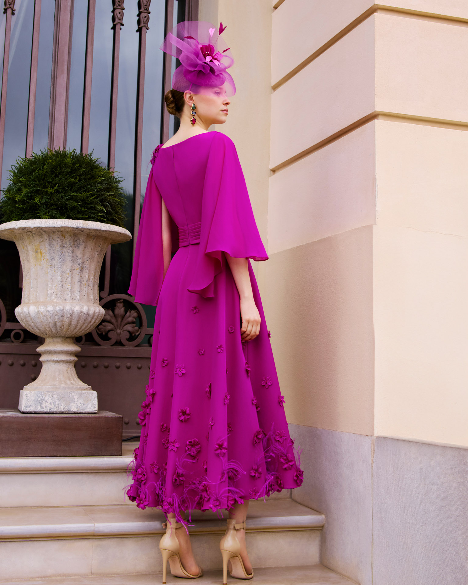 Style 1G1A4, arriving in store for Spring/Summer— A midi length evening dress made with a gorgeous crepe. Featuring a sweetheart neckline, cape sleeves, and an open back detail. Decorated with a cape sleeve, 3D floral appliques and feathers.