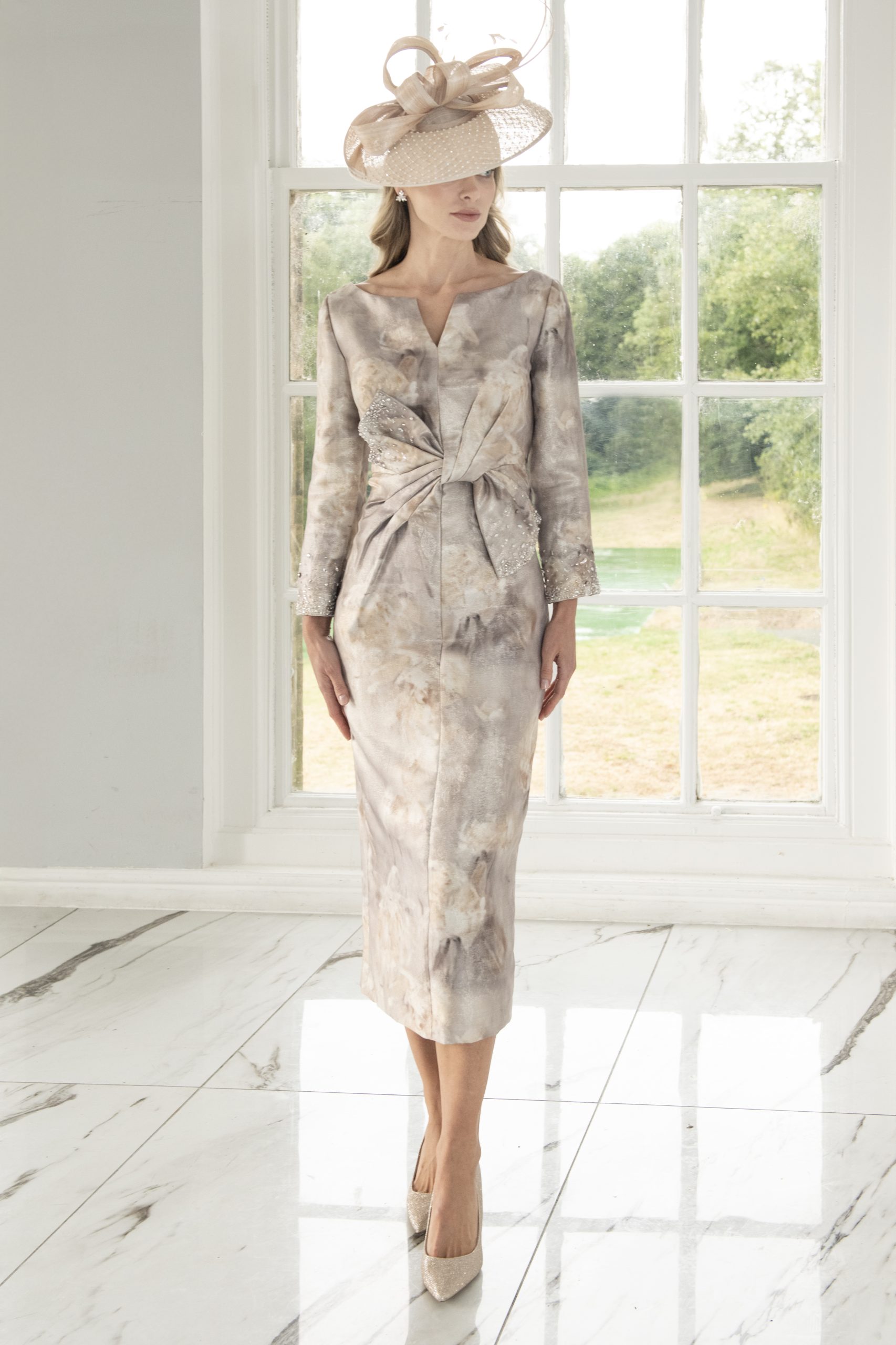 Veromia Irresistible Spring/Summer 2026 Style 8802 is a stunning gold dress featuring a v-cut neckline, ruched waistline with a bow effect, full-length sleeves, and a fitted midi skirt. Designed for elegance and modern sophistication, it flatters the figure while offering comfort and style. Perfect for weddings, formal events, or evening occasions, this luxurious dress catches the light beautifully, adding a radiant and glamorous finish.