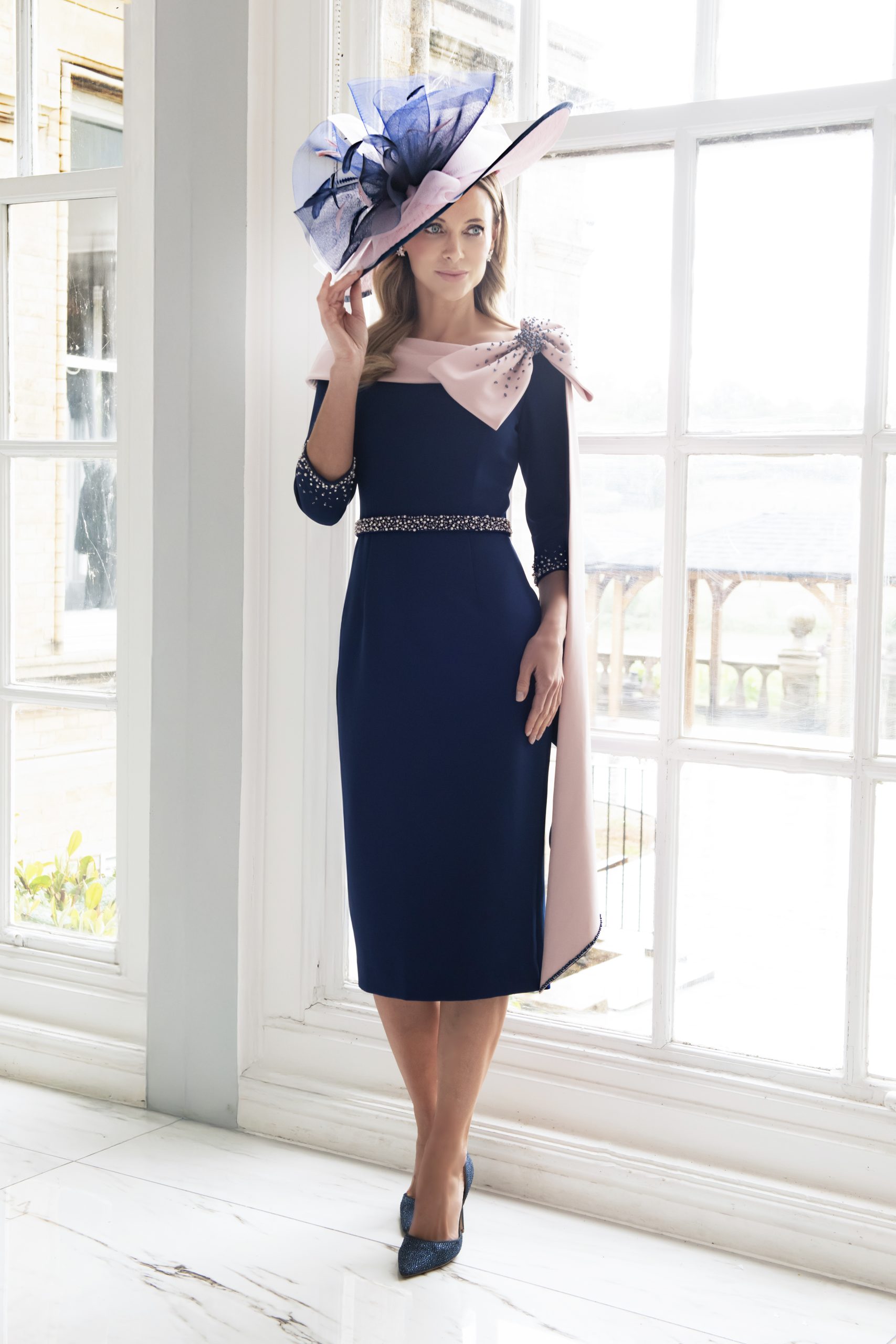Elevate your occasion wardrobe with Veromia Irresistible Style 8810 from the Spring/Summer 2026 collection. Available in two-tone pink and navy, this elegant dress features a boat neckline, draped off-the-shoulder design, and a bow detail with delicate beading. The high-waisted, belted silhouette with beaded accents enhances your shape, while the fitted midi skirt creates a polished and sophisticated look. Perfect for weddings, or special events, Style 8810 combines timeless elegance with modern design for effortless style.