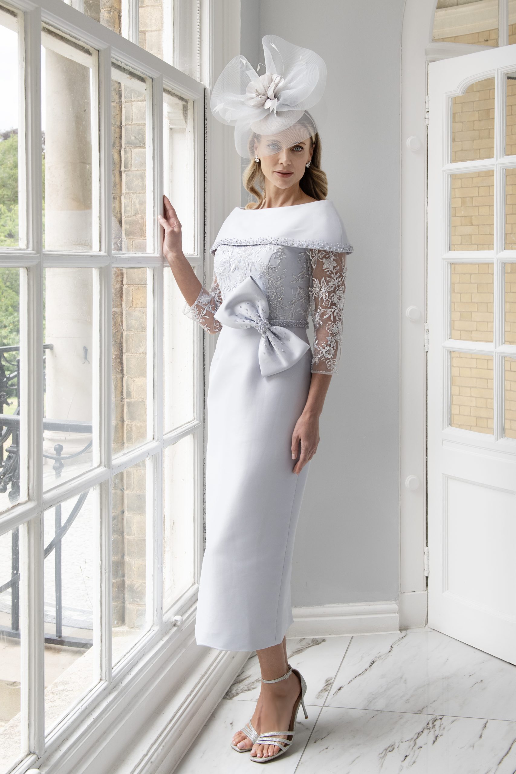Veromia Irresistible Style 8811 from the Spring/Summer 2026 collection is a stunning silver dress featuring a wrap neckline, bow with beading at the waist, lace bodice, 3/4 sleeves, and a fitted midi skirt. Perfect for weddings, cocktail parties, or formal events, this elegant design combines timeless sophistication with modern detailing, offering a flattering and polished look for any special occasion.