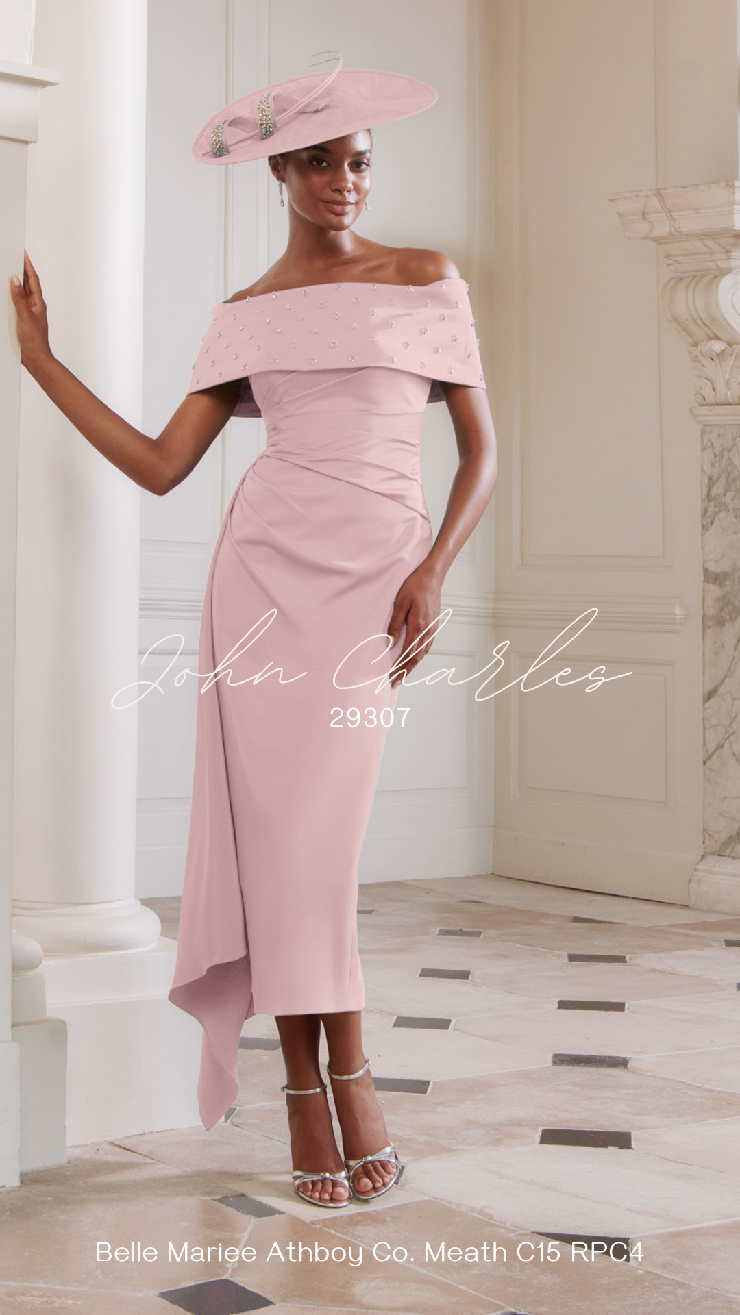 An elegant off-the-shoulder midi dress with subtle embellishment, a flattering fitted bodice, and a modern asymmetric hemline.