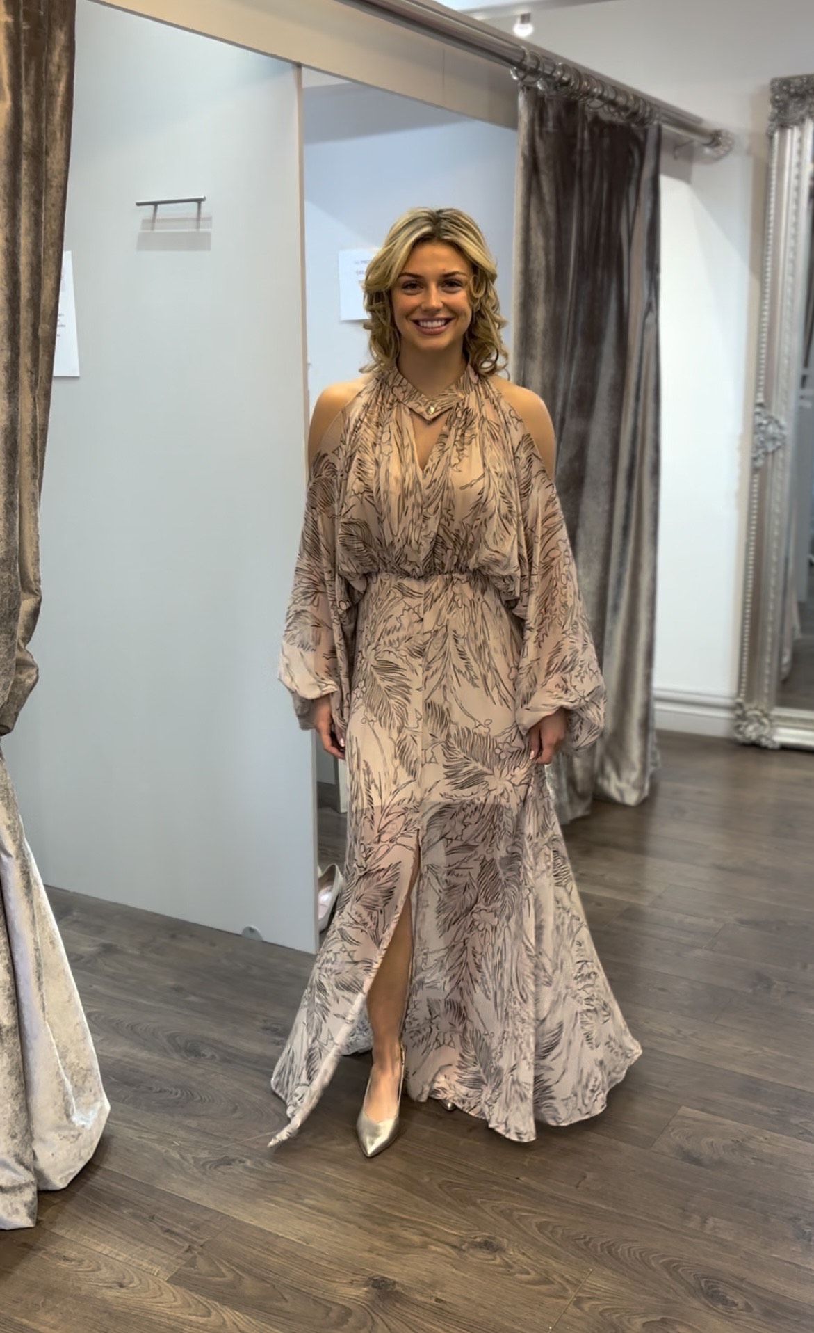 Kameya 41001 is a neutral print chiffon midi dress featuring full sleeves, a V-shaped neckline with gold button collar, elastic waist, and delicate gold thread detailing.