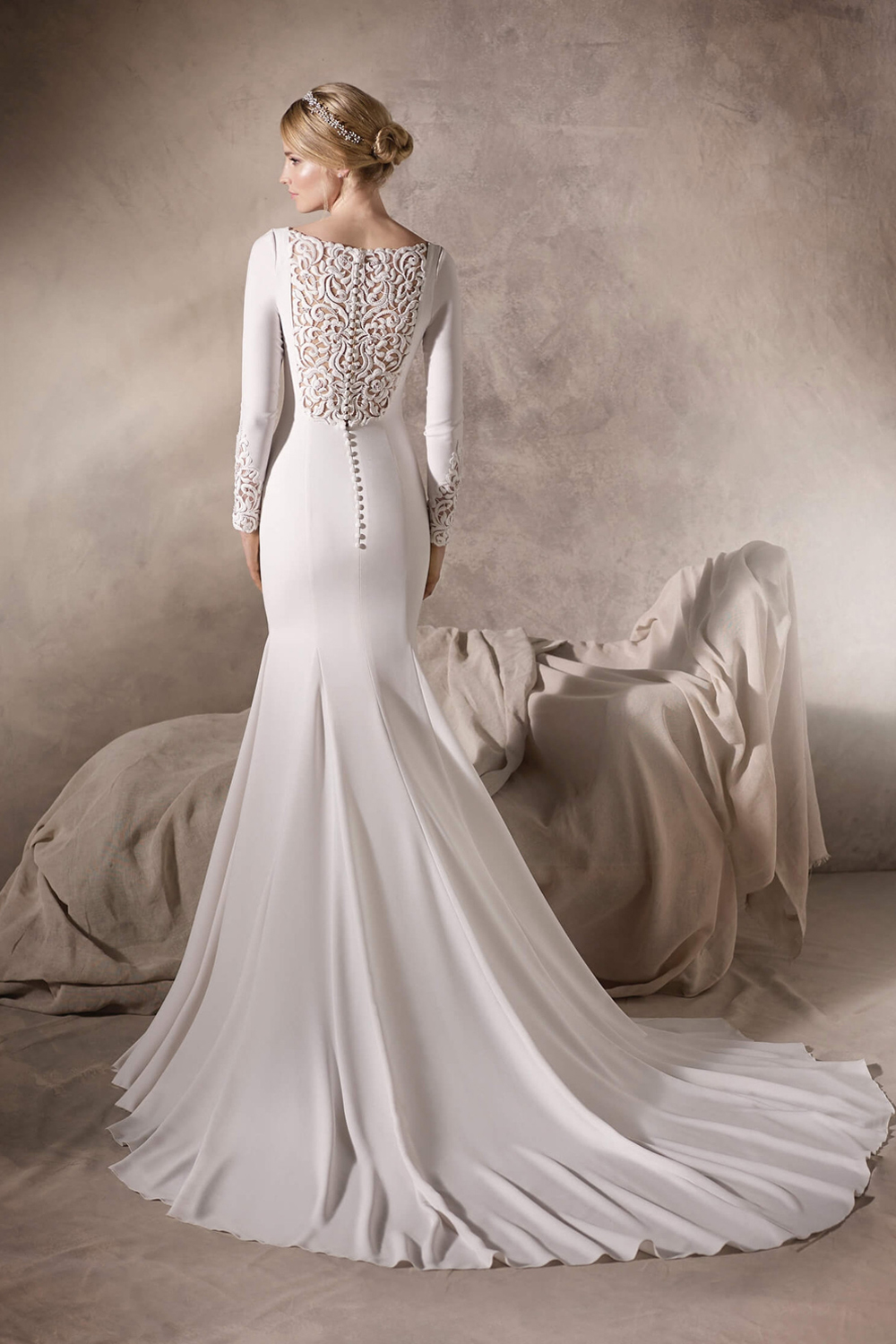The La Sposa Hailey wedding gown, with its straight-cut silhouette crafted in luxurious crepe, exudes timeless elegance and refined beauty. The bateau neckline and long sleeves add a touch of grace and classic charm, while the intricate lace back and sleeve detail, along with tulle embellishments, create a captivating focal point for a bridal look that is both sophisticated and memorable.