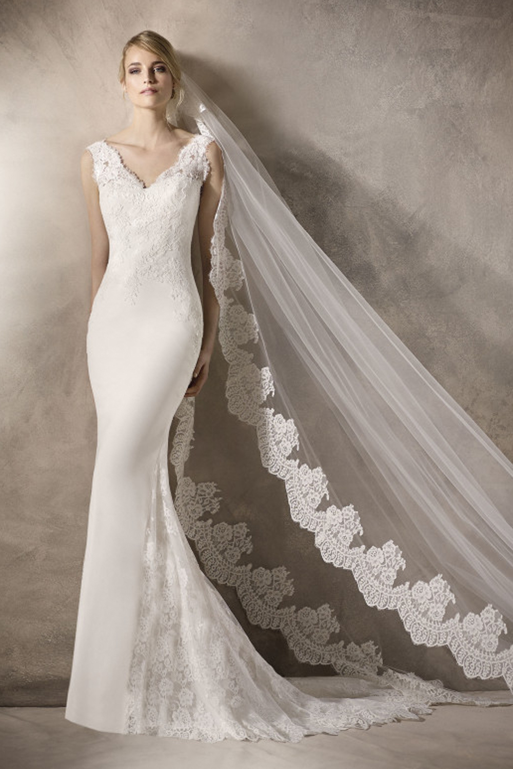 The La Sposa Haim wedding gown, crafted from luxurious crepe, seamlessly blends elegance and sophistication for a timeless and unforgettable silhouette. With a flattering trumpet style, V-neckline, and delicate lace embellishments, this gown strikes a perfect balance between classic and contemporary, creating a masterpiece that harmonizes modern design with the essence of romance for your special day.