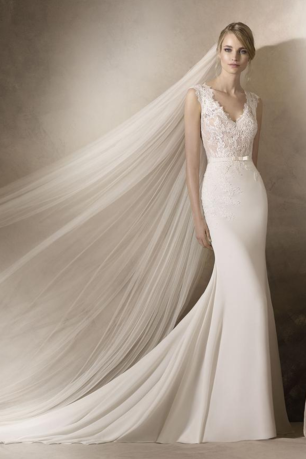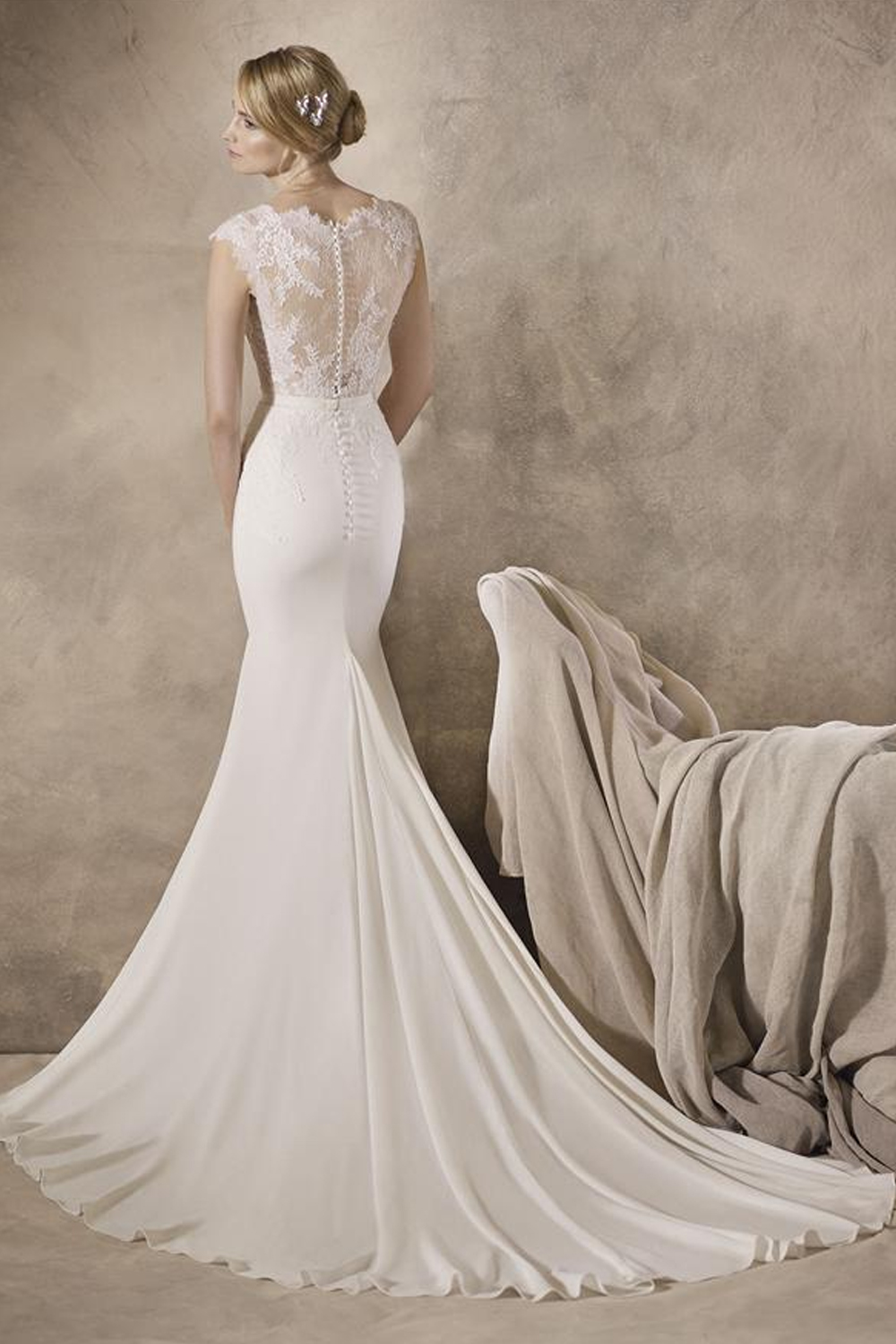 The La Sposa Haldisa wedding gown, crafted from luxurious crepe and Chantilly lace, presents an enchanting and timeless bridal look with a prominent V neckline, scalloped lace accents, and a stunning illusion lace back adorned with matching crepe buttons. The lightweight train adds grandeur, creating a perfect blend of grace and romance for an utterly captivating and sophisticated appearance on your special day.