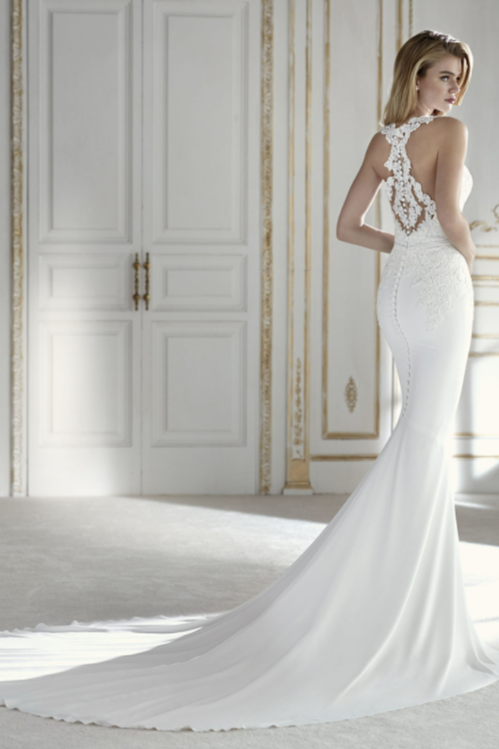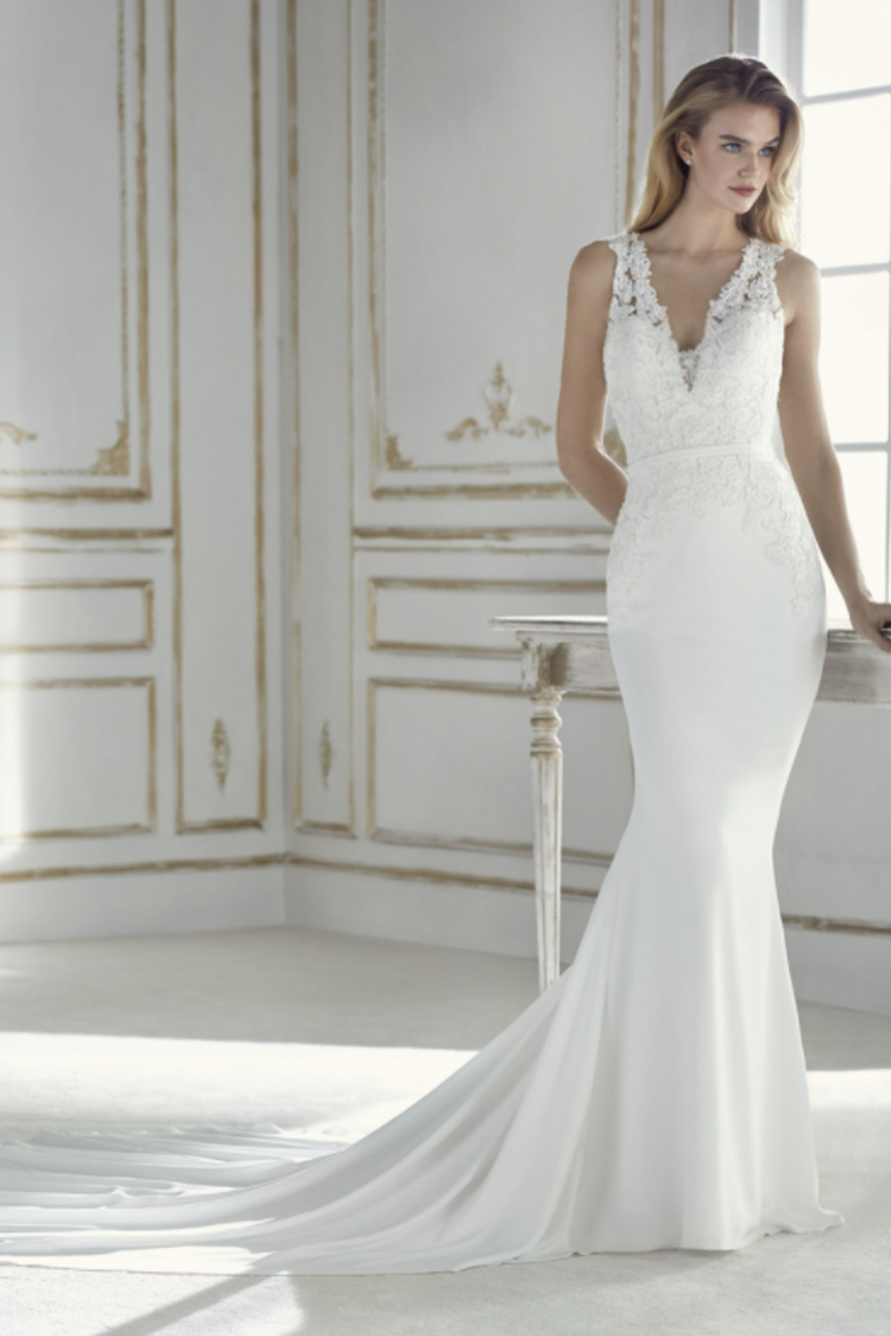 The La Sposa Paden wedding gown is a timeless mermaid dress that seamlessly blends crepe and intricate thread embroidery appliqués for a touch of romance and sophistication. Featuring a V-neck racer back bodice adorned with sparkling beadwork, a discreet crepe waistband adds subtle sophistication, making it a statement of grace and timeless beauty for your special day.