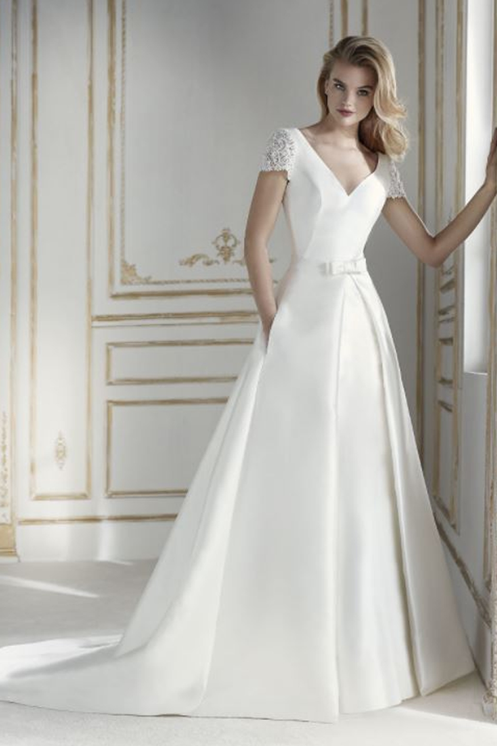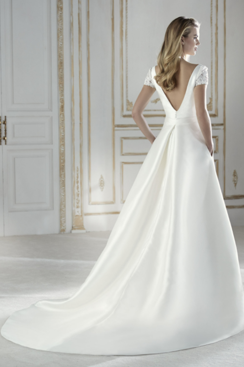 The La Sposa Premisa wedding gown, crafted in luxurious satin, offers unmatched elegance and versatility with a fit & flare skirt that seamlessly transitions into a detachable overskirt. The sleek bodice features intricate detailing, a discreet V-neck in the front, and a deeper V on the back, while short beaded guipure sleeves add glamour and a unique flair, creating a harmonious and refined look for brides seeking a truly unforgettable bridal experience.