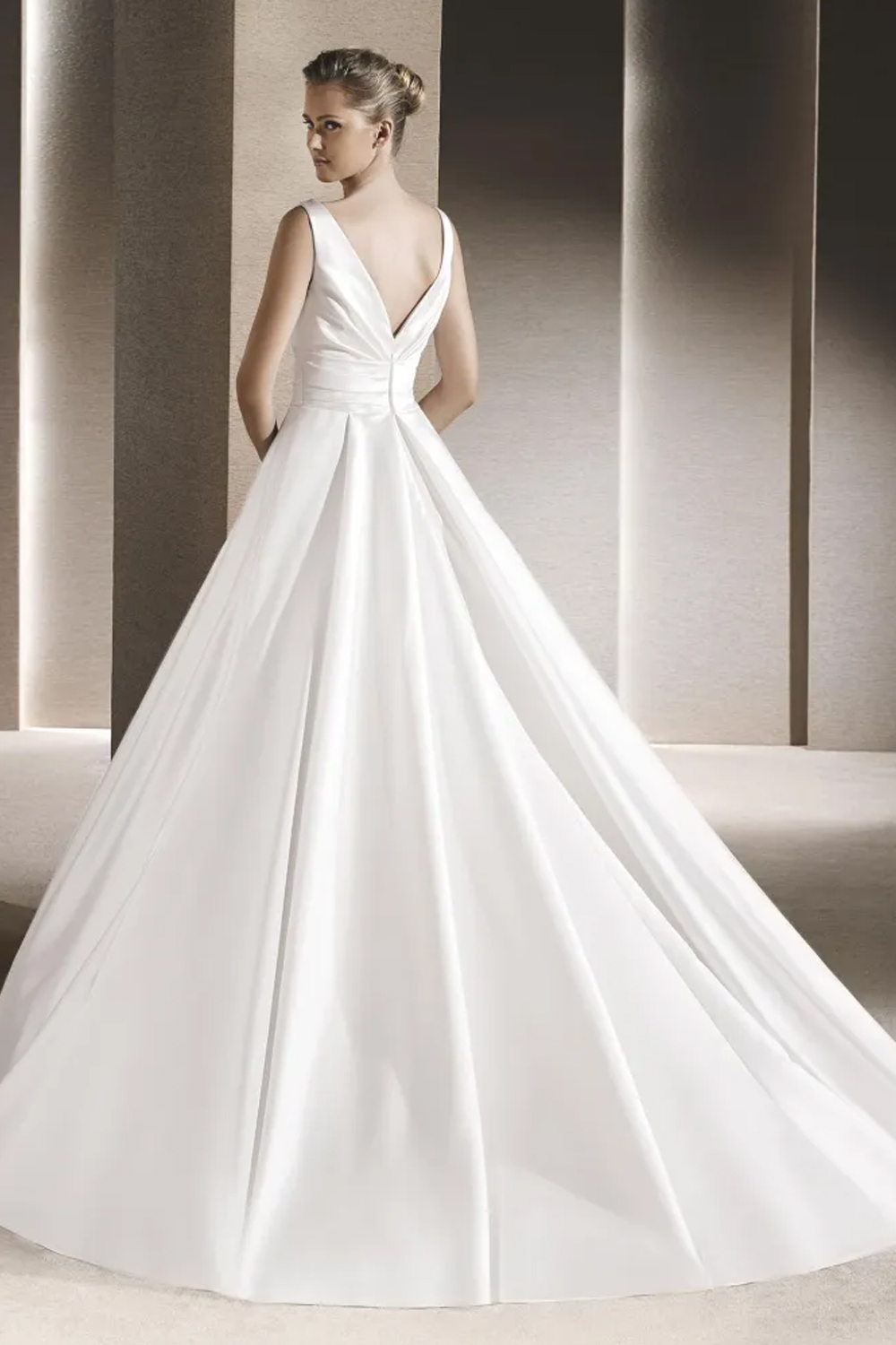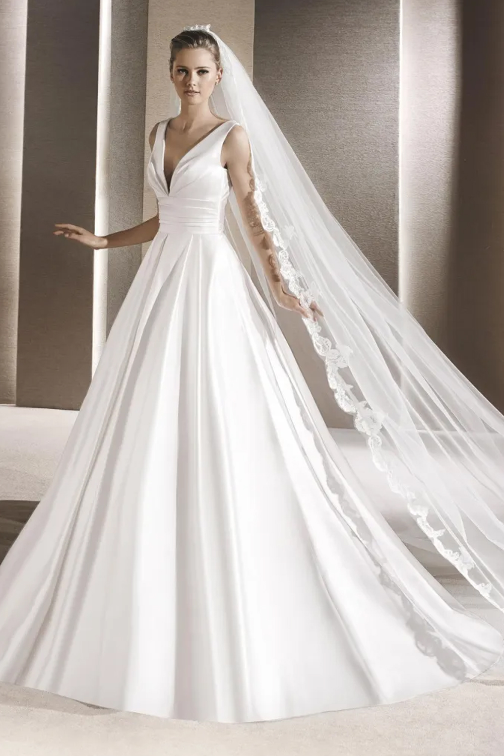 The La Sposa Ralea wedding gown embodies timeless elegance with its A-line satin silhouette, featuring a deep plunging neckline for allure and a not-too-low V-back for a modern yet timeless design. With box pleats in the skirt and practical pockets, this gown is a celebration of understated glamour, offering a chic and comfortable look for brides seeking simplicity and grace on their special day.