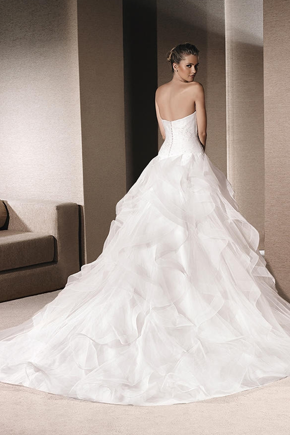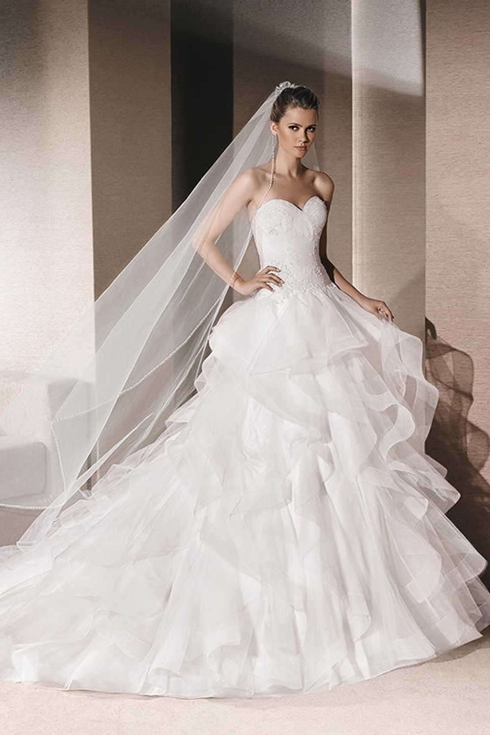 The La Sposa Remigia wedding gown, an enchanting A-line silhouette, seamlessly combines elegance and romance with a touch of sparkle. Adorned with exquisite floral lace, crystals, and sparkling beads, this masterpiece features a fabulous long train, ruffle skirt, and meticulous bodice detailing, creating a captivating bridal ensemble that celebrates timeless beauty and sophistication.