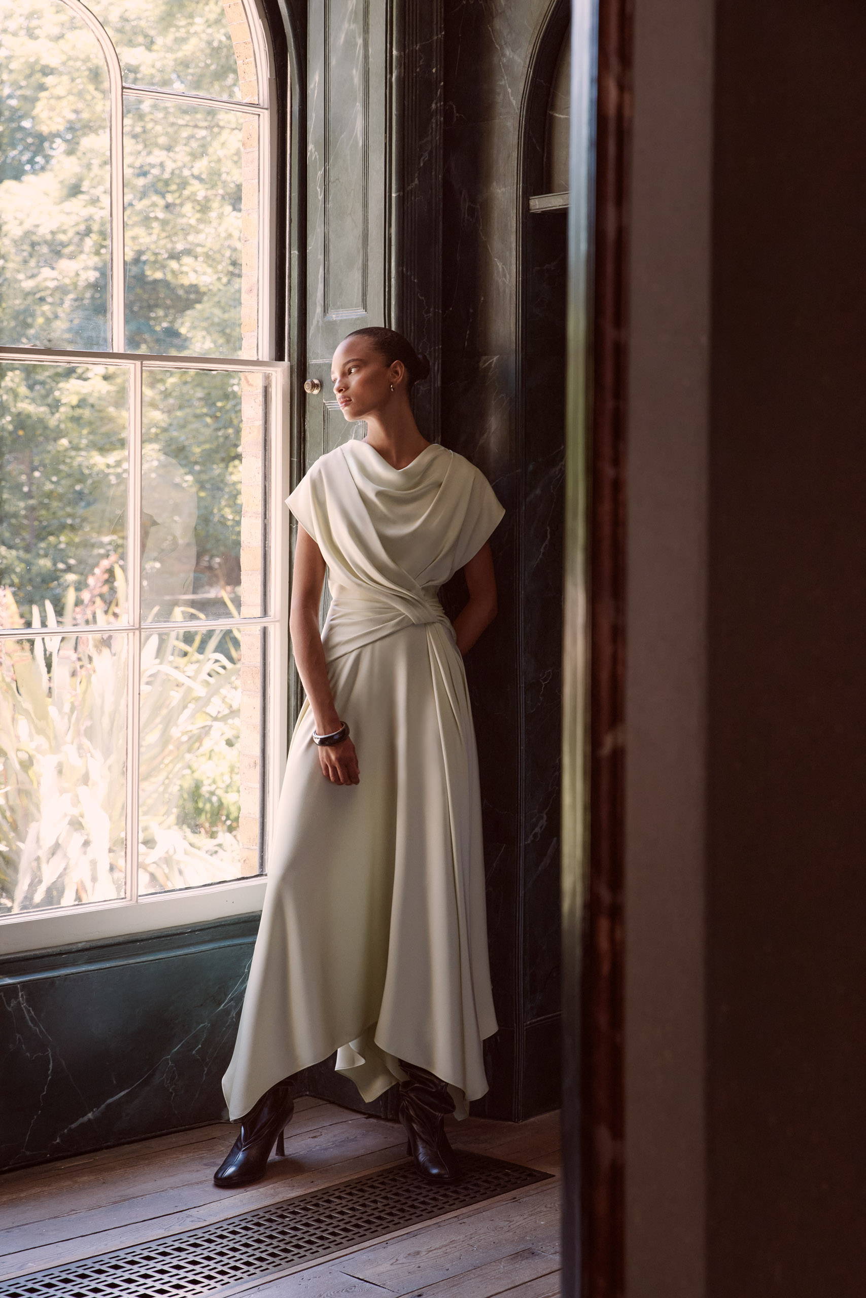 Discover the Maisonel Style 3079 Lemonade midi dress — a satin A-line with a cowl neck and twisted waist, perfect for weddings and elegant occasions.