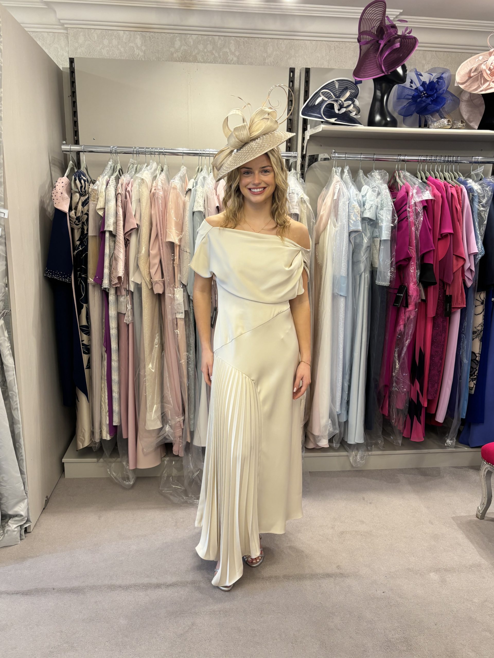 Maisonel Style 3139 dress, an exquisite A-line midi dress that blends timeless elegance with modern allure. Crafted from crepe, this design drapes beautifully over the body, offering a soft sheen that enhances its feminine silhouette. The highlight of this piece lies in its pleated skirt panel, which adds graceful movement and subtle texture, creating a look that is both refined and romantic.