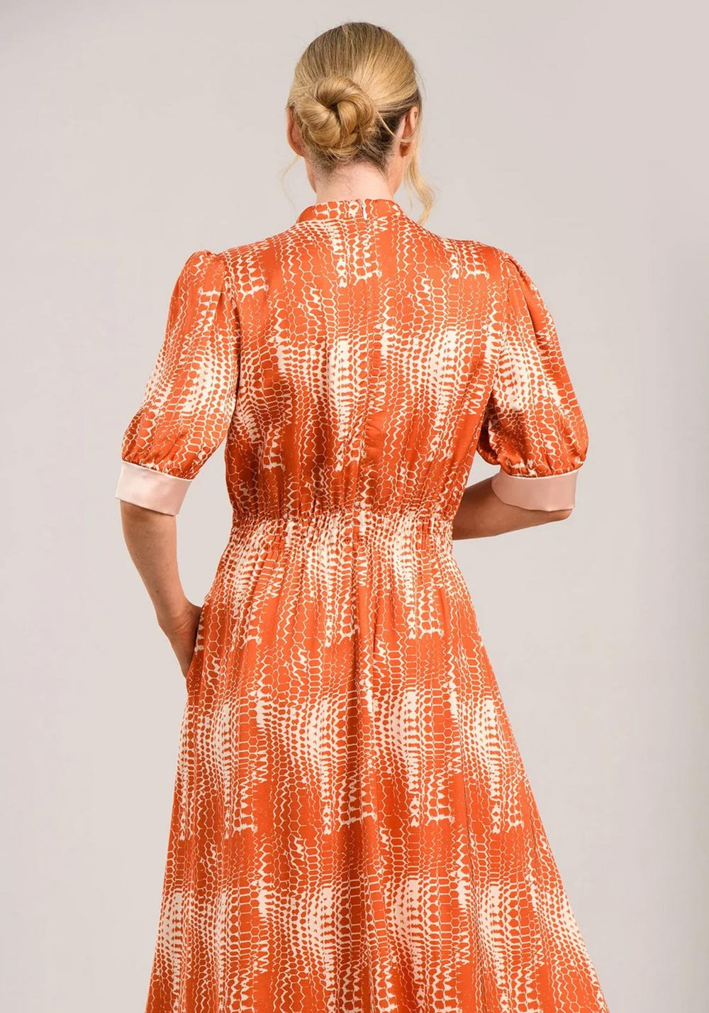 The Dove midi dress by Sisters by Caroline Kilkenny features a terracotta print, puff sleeves, and a flattering A line silhouette.