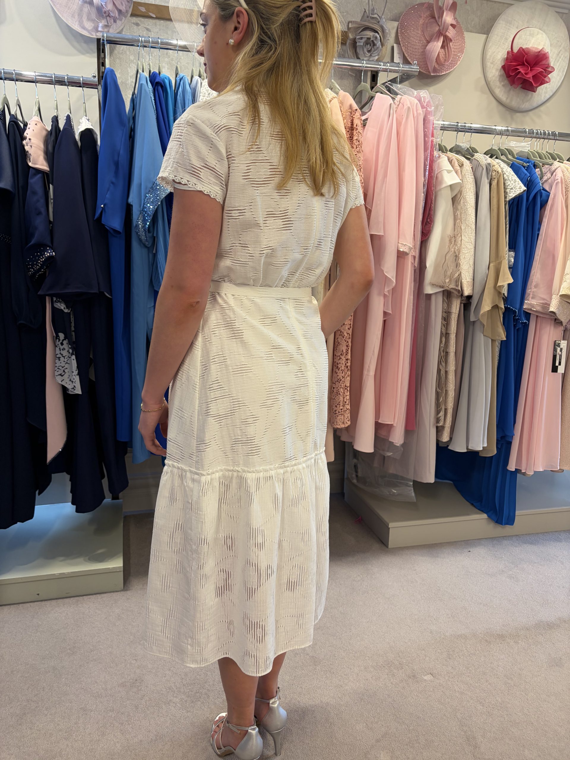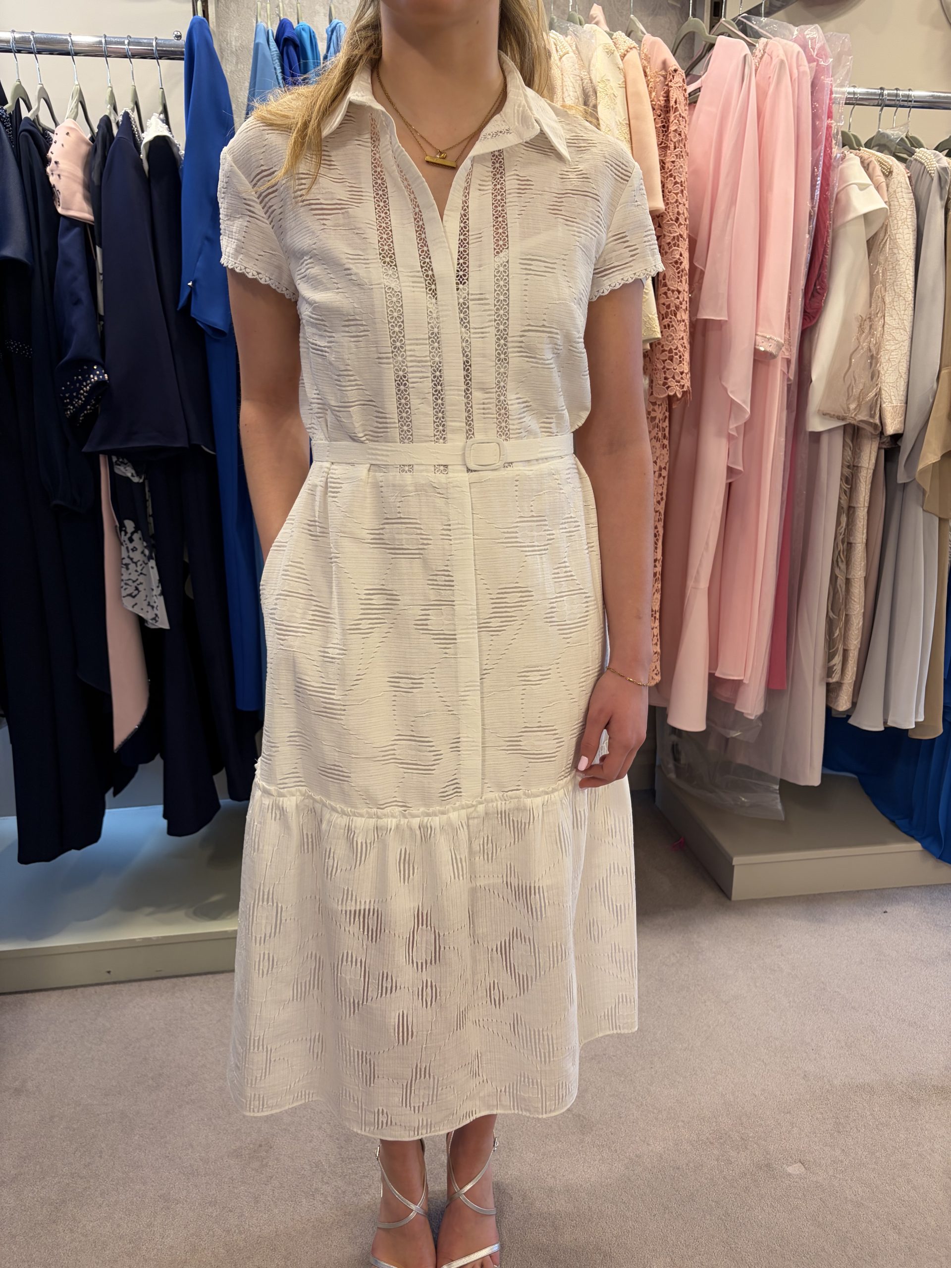 An elegant Caroline Kilkenny midi dress featuring a shirt-style bodice, textured fabric, and flattering belted waist, perfect for summer occasions.