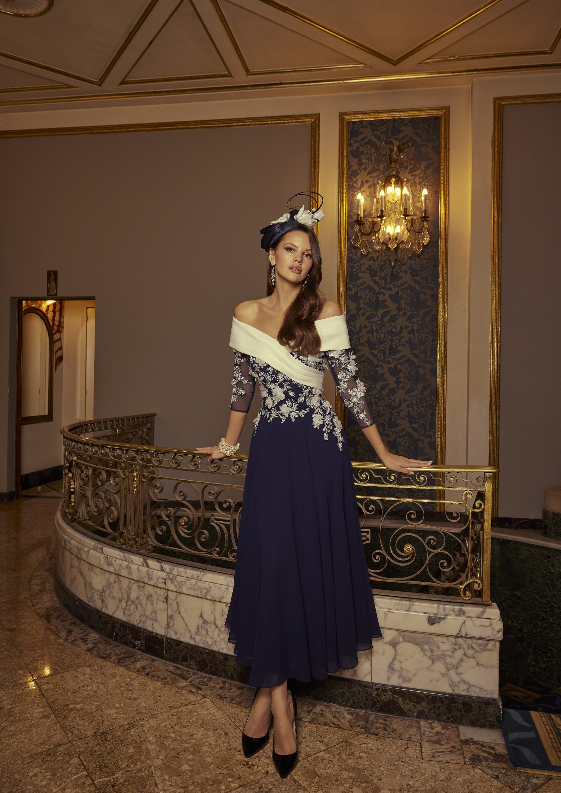 Veni Infantino’s Style 992568 is an elegant and luxurious gown, perfect for a formal or red carpet event. This dress features a fitted bodice with intricate lace embroidery in a contrasting silver or light color, creating a striking visual effect against the deep navy blue fabric. The off-shoulder neckline adds a touch of sophistication and femininity, while the sheer, three-quarter length sleeves with lace details enhance the overall delicate and refined aesthetic. The skirt flows gracefully to a midi or full-length hem, with soft pleats that add movement and elegance. Paired with statement earrings, a clutch, and classic heels, Style 992568 exudes timeless glamour and high fashion.