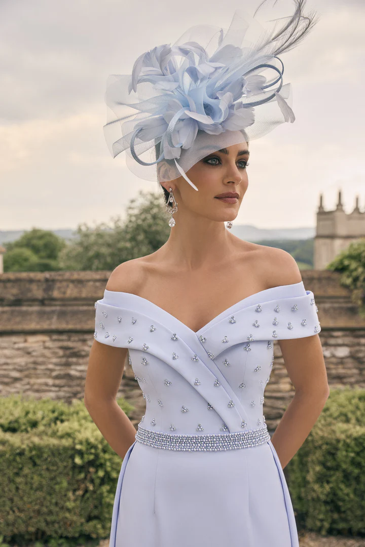 Chic and contemporary, this mother-of-the-bride fit-and-flare crepe dress features a beaded wide V-neckline, cap sleeves, and a pleated bodice. Finished with a beaded waistband and unique half overskirt, it combines structure, movement, and modern elegance.